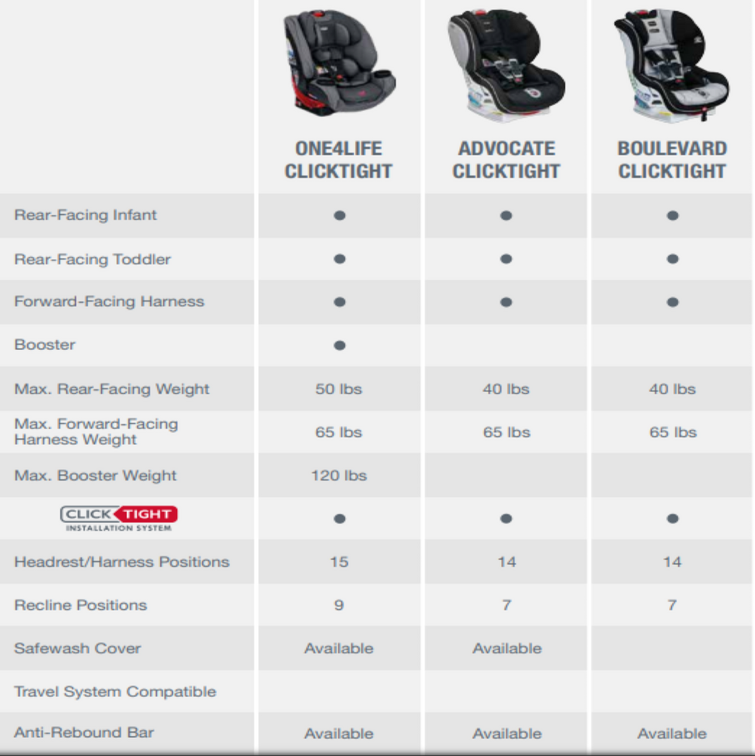 One4Life takes your child from birth to big kid with Britax Safety and ClickTight Installation. It converts from a rear-facing infant car seat, to a forward-facing 5-point harness seat, to a high-back belt-positioning booster seat. SafeWash cover is safe to machine wash and dry. ClickTight is as easy as buckling a seat belt, so you can install with confidence, every time. A high-strength steel frame, crumple zone, and V-shaped tether help absorb crash energy.